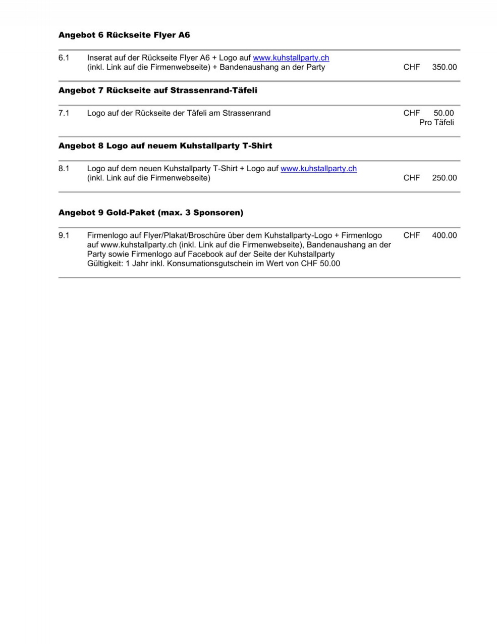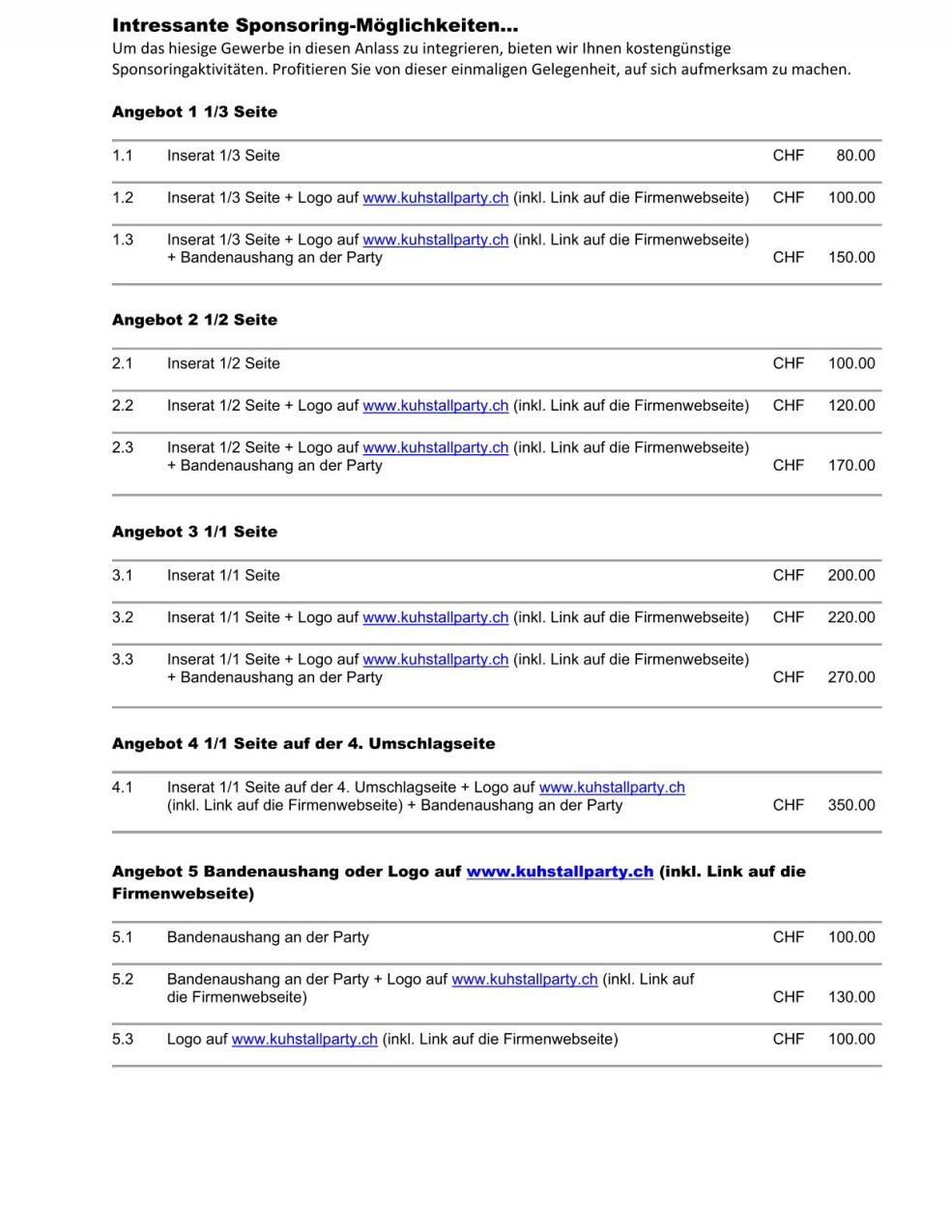 Hier finden SIe eine Übersicht wie SIe die Kuhstallparty als Sponsor unterstützen können.